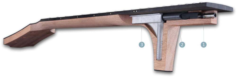 - Plně nastavitelná dvoucestná výztuha pro velmi jemné nastavení průhybu krku v obou směrech.